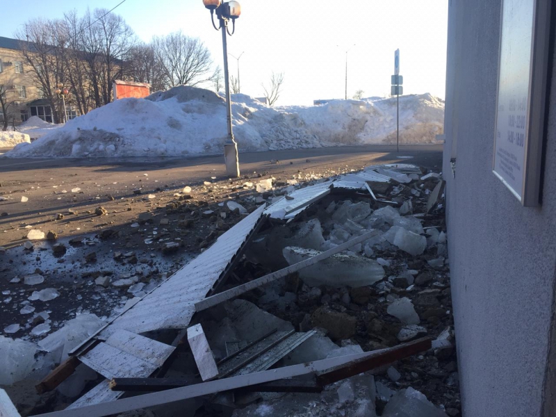 Автор поста Екатерина Тертышная опубликовала несколько снимков с места происшествия. На них видно, что на земле рядом со входом в здание лежат металлические листы, составлявшие облицовку карниза. Рядом валяются части штукатурки, а также массивные ледяные глыбы. С креплений при этом сорвало несколько кондиционеров. Место обрушения огородили.