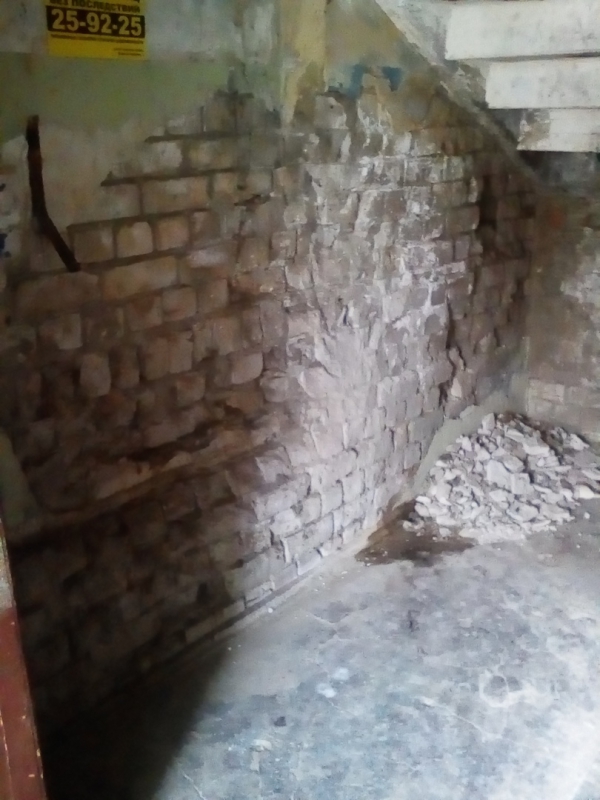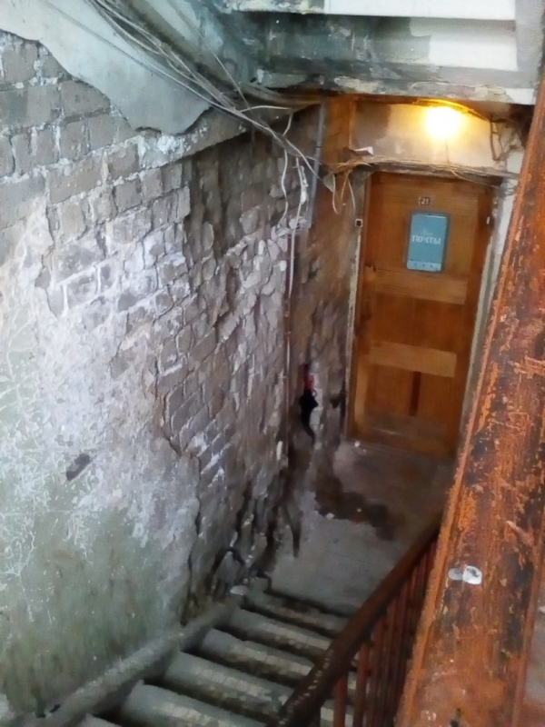 На опубликованных фотографиях видно, что две ступеньки на 1-м этаже провалились вниз, образовав огромную яму. Таким образом, проход по лестничному маршу стал крайне небезопасен для жизни и здоровья. Кроме того, стены дома крошатся на глазах, кирпичи вываливаются в различных местах, оставляя крупные дыры.