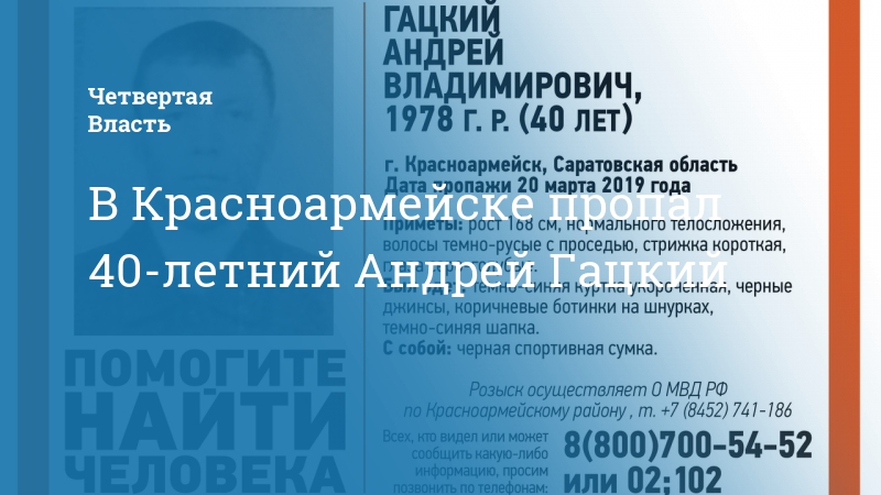 В Красноармейске Саратовской области пропал 40-летний Андрей Гацкий. Об этом сегодня, 2 апреля, сообщает поисковый отряд «Лиза Алерт».