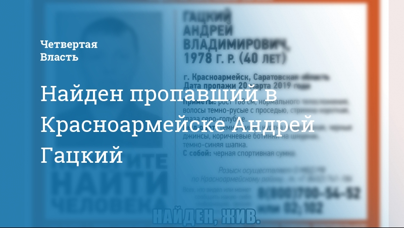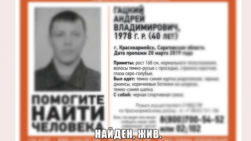 Пропавший 20 марта в Красноармейске Саратовской области 40-летний Андрей Гацкий найден живым. Об этом сообщает поисковый отряд «Лиза Алерт».