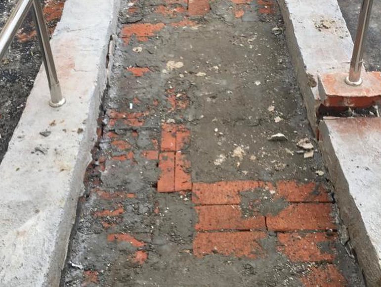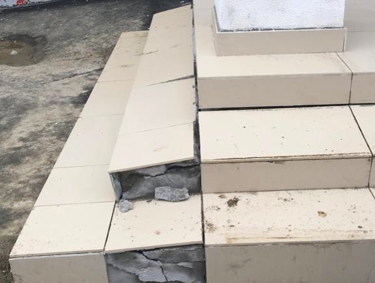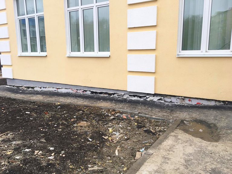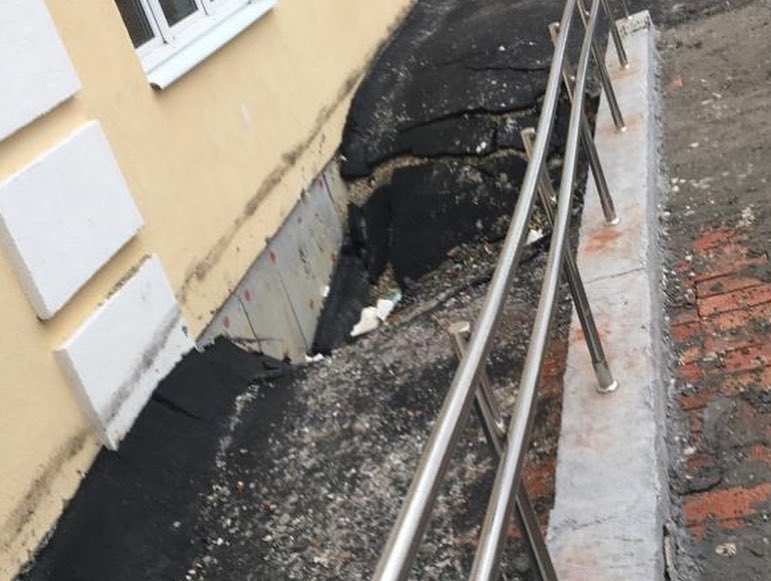 Фотографии прислали местные жители. На снимках видно, что повреждения есть и у самого здания: просел пандус, разрушились ступени крыльца.