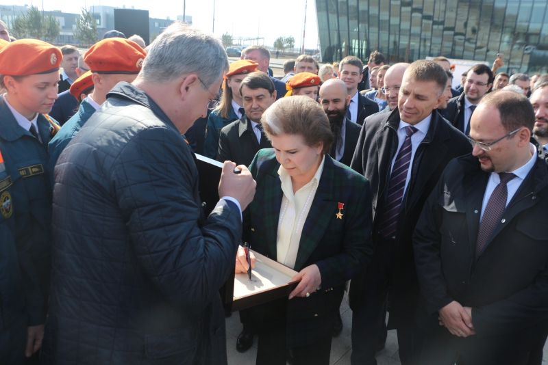 Теперь на аллее появятся таблички с именами космонавтов, которые посетят аэропорт. Первая, конечно же, будет посвящена Валентине Терешковой. Для этого она оставила свой автограф, который выбьют на металле.