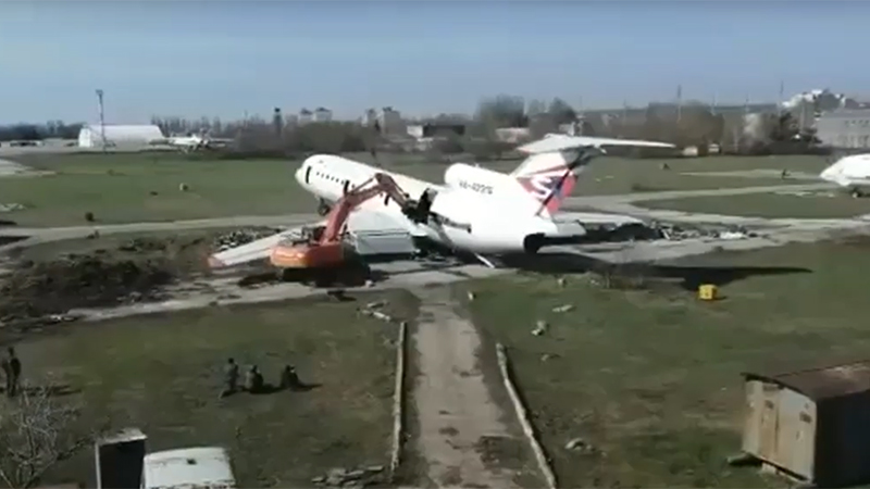 На опубликованном видео видно, как фюзеляж самолета разламывают экскаватором. Как сообщается в сообществе, после аннулирования сертификата «Саравиа» на авиаперевозки самолеты продали ТМК «Чермет-Саратов».
