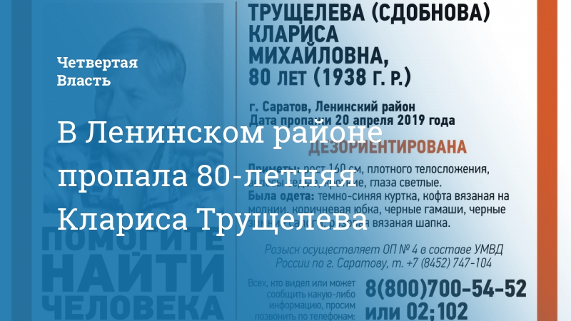 В Ленинском районе Саратова пропала 80-летняя Клариса Трущелева (Сдобнова). Об этом сообщает поисковый отряд «Лиза Алерт».