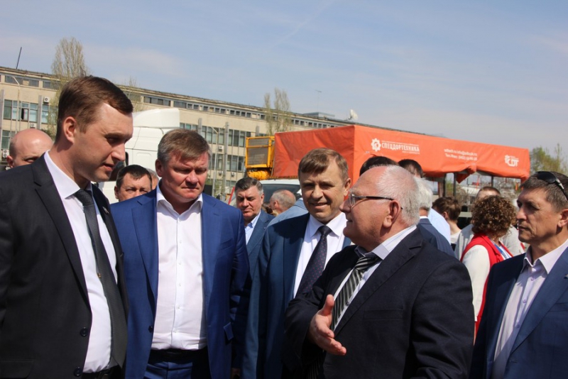 Перед началом дискуссии на Театральной площади Саратова состоялся осмотр дорожной техники городскими и областными чиновниками. Среди них оказались заместитель председателя правительства Саратовской области Роман Бусаргин, глава Саратова Михаил Исаев и его заместитель по городскому хозяйству Максим Сиденко, а также министр транспорта и дорожного хозяйства региона Николай Чуриков.