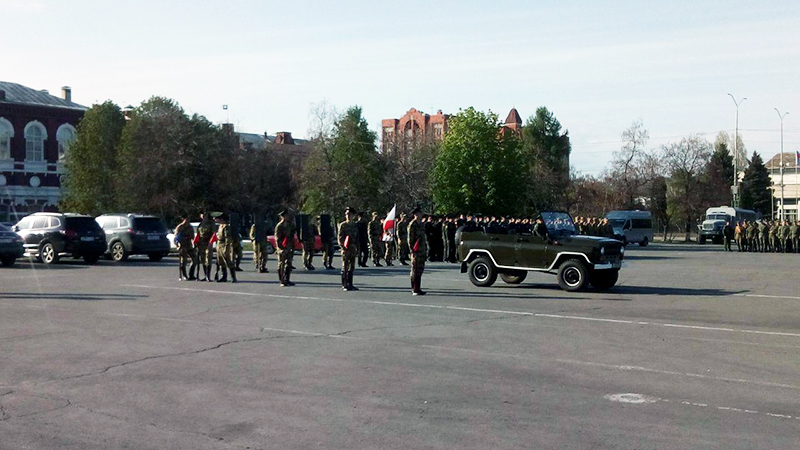 На месте видны ряды военнослужащих, парней и юношей в красочных беретах, рядом с ними ездит автомобиль с «командующим Парада».