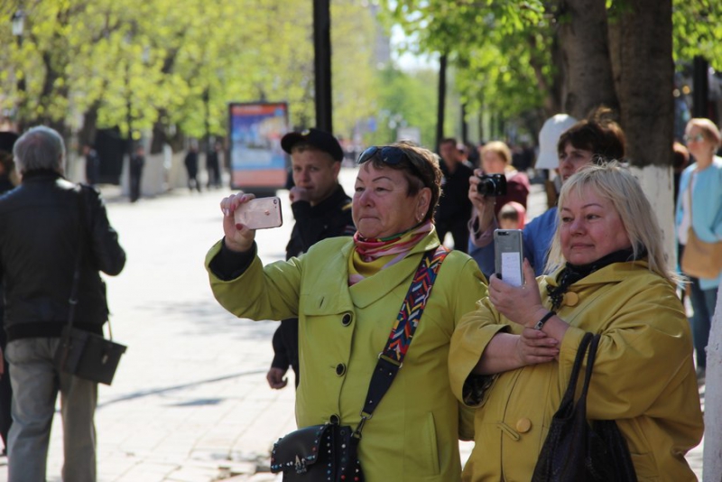 По пути на проспекте демонстрантов аплодисментами и радостными криками встречали прохожие. Многие снимали шествие на видео, другие делали селфи на фоне колонн.