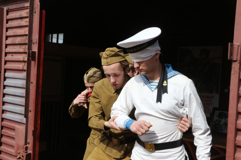 Накануне прибытия поезда у сцены артисты танцевали под песни военных лет. В руках у девушек были цветы. Как только «Военный эшелон» начал приближаться к вокзалу, к нему побежали изображавшие родственников солдат девушки. Из вагона-теплушки вышли «фронтовики» и обнимали встречающих. После этого начался праздничный концерт с исполнением знаменитых военный композиций – «Катюши», «Дороги на Берлин», «Поклонимся великим тем годам» и т.д.