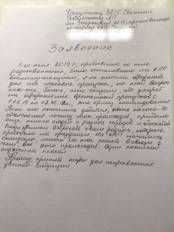 Правда, некоторые граждане каким-то образом все же смогли добиться, чтобы их близких пропустили на территорию ЗАТО. К примеру, один мужчина, офицер запаса, к которому должна была приехать дочка из Тамбова, открыто заявил Требунскому, что «договорится».