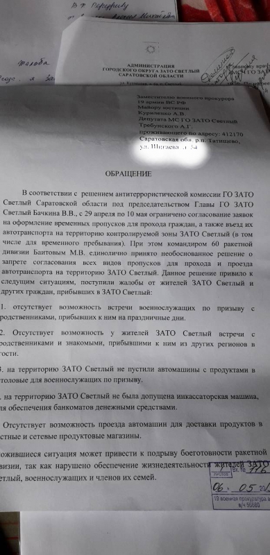 Так, в течение нескольких дней в ЗАТО у военнослужащих по призыву и жителей округа не было возможности увидеться с родственниками и знакомыми, прибывшими к ним на праздничные дни. К примеру, даже дочка жительницы Амировой, учащаяся Саратовского художественного училища имени Боголюбова, имеющая прописку в Светлом, не смогла пройти КПП и встретиться с родителями. На территорию даже не пустили машину с продуктами для столовых, обеспечивающих питанием военнослужащих по призыву, инкассаторы не смогли наполнить банкоматы денежными средствами.