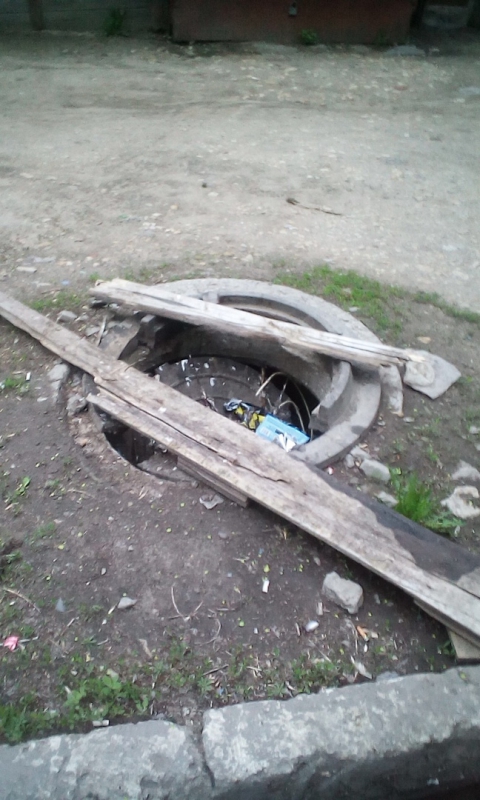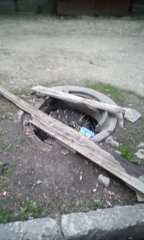 На приложенных фотографиях видно, что один из колодцев засыпали деревянными досками. Второй, где под землю ушла крышка люка, положили две палки.