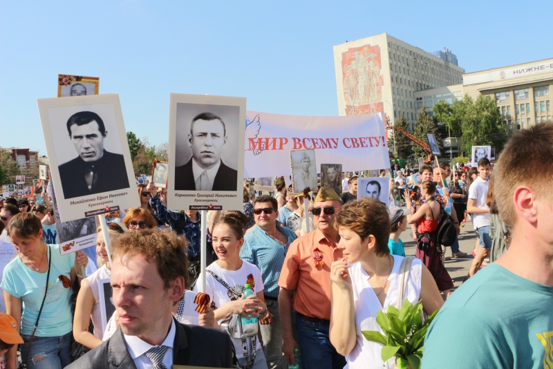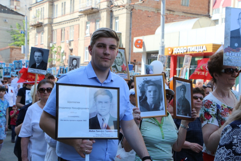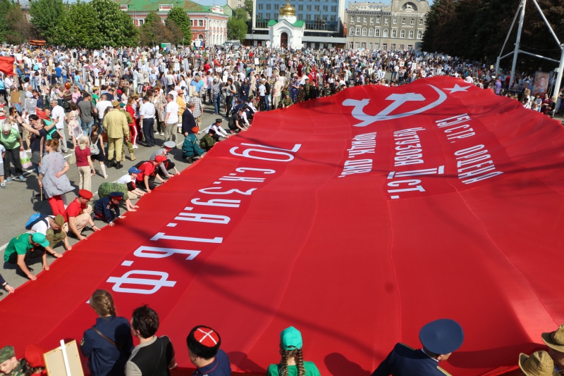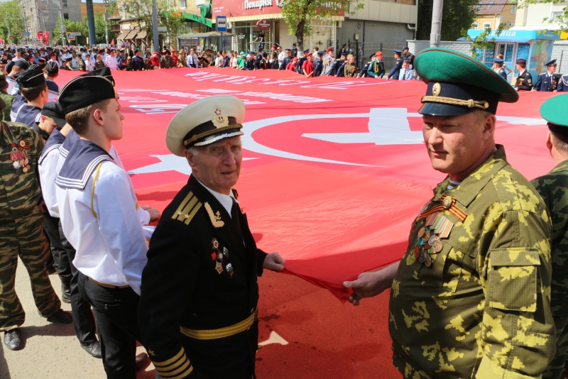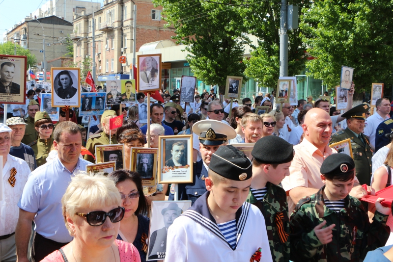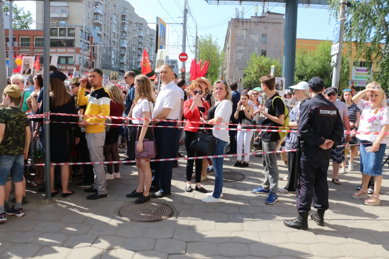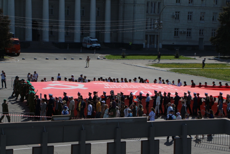 Возглавили многотысячную колонну кадеты, бывшие военнослужащие и казаки. Они несли 50-метровую копию Знамени Победы. Потом шел оркестр, который исполнял военные марши. Кроме того, некоторые участники акции пришли с баянами и играли на них песни военных лет, им подпевали все окружающие.