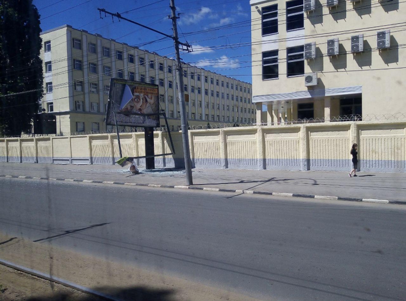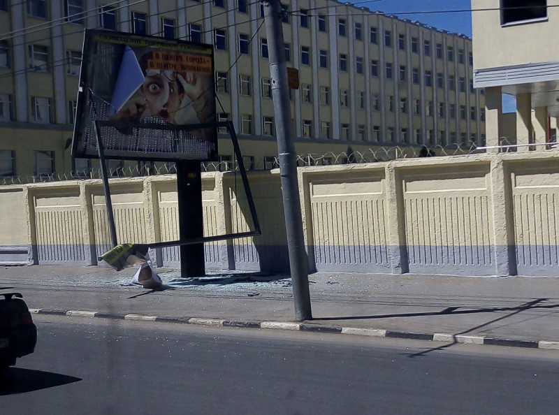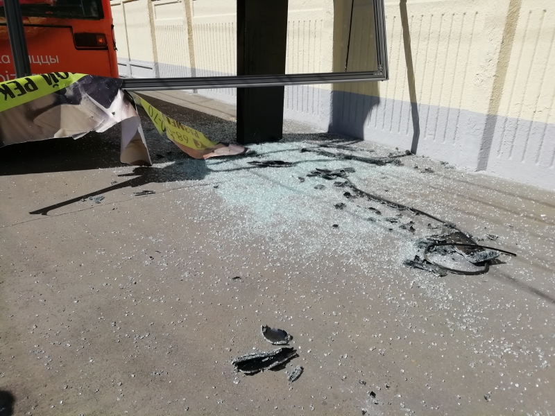 В результате у щита оказался отогнут металлический лист, а также разбито стекло.
