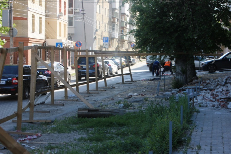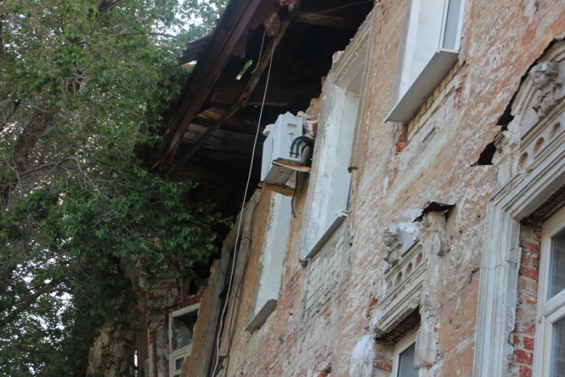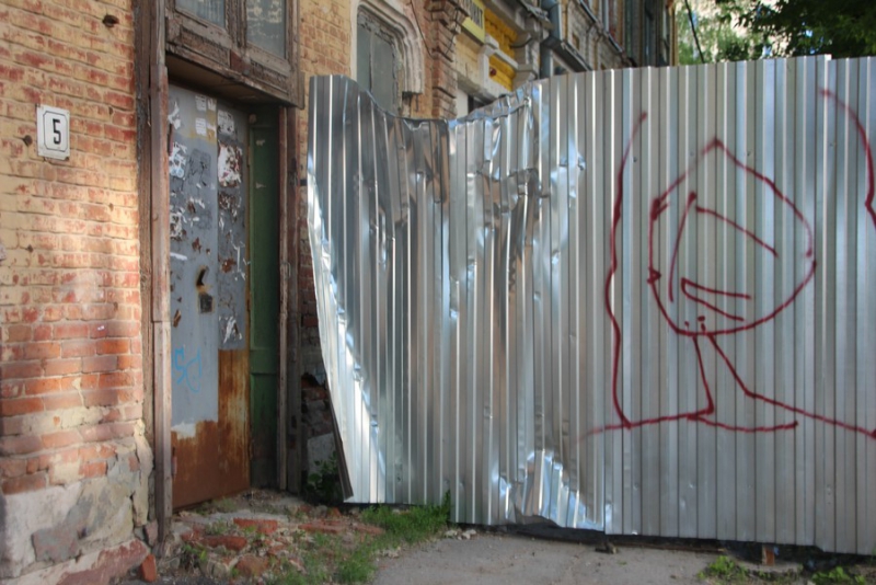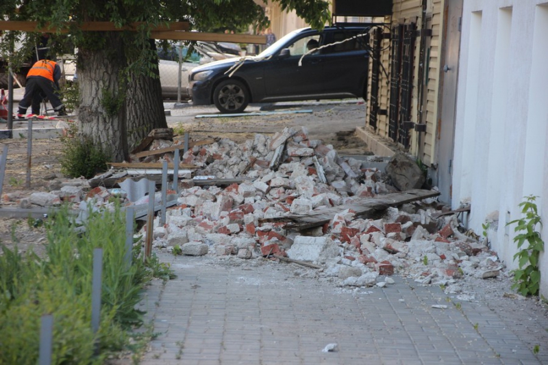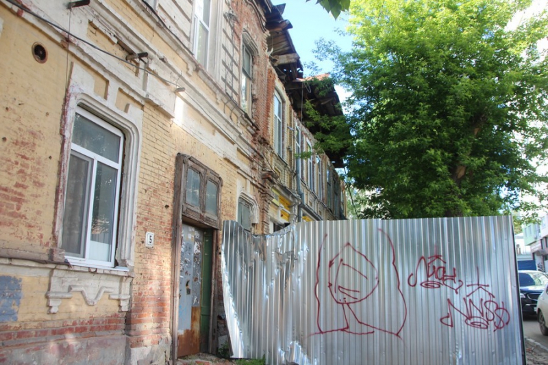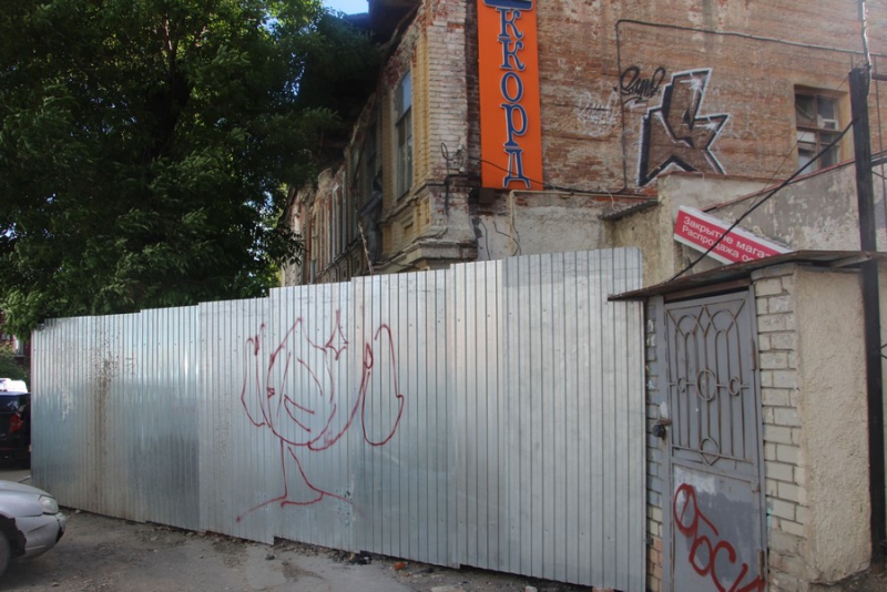 Здание на Радищева, 5, известное также как дом генерала Деникина, где обрушение фасада произошло в начале февраля, также до сих пор находится в разваленном состоянии. В марте опасный тротуар отгородили высоким забором, который сейчас превратился в полотно для уличных рисунков. Кроме того, с одной стороны забор уже оказался помят.
