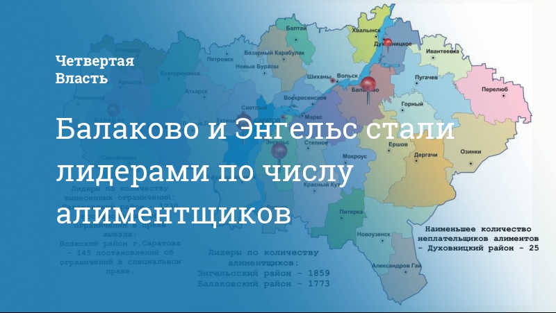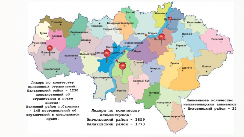 Районами-лидерами по привлечению должников по алиментам к административной ответственности по статье 5.35.1 КоАП РФ (неуплата средств на содержание детей или нетрудоспособных родителей), а также к уголовной ответственности по статье 157 (неуплата средств на содержание детей или нетрудоспособных родителей) УК РФ являются Балаковский — 72/35 должников, Энгельсский — 61/41 и ОСП по Балашовскому, Романовскому и Самойловскому районам – 68/21.