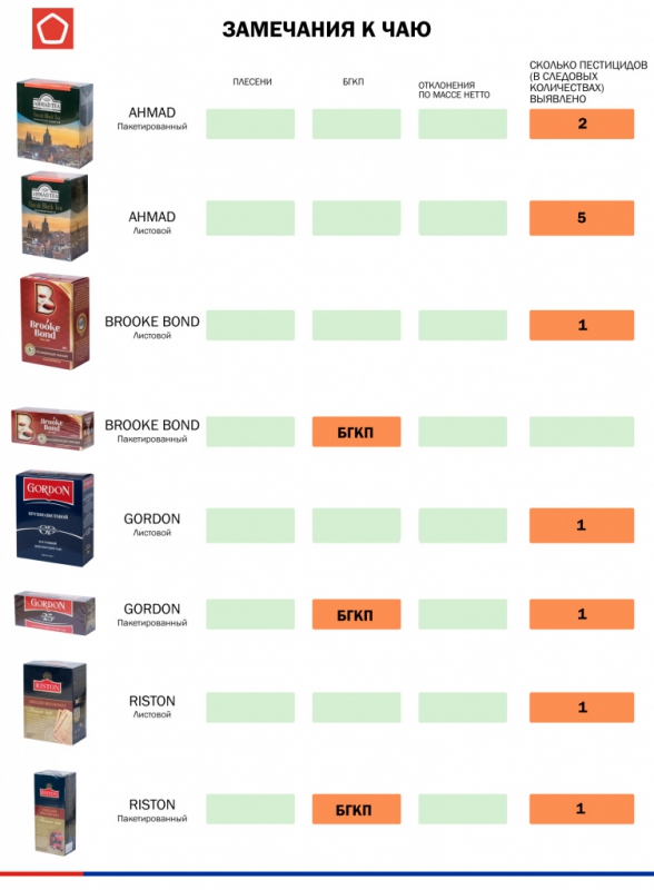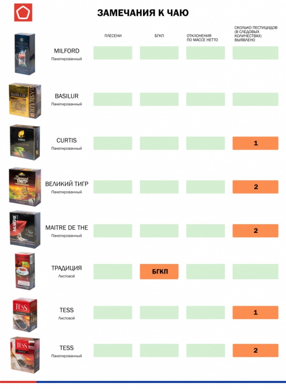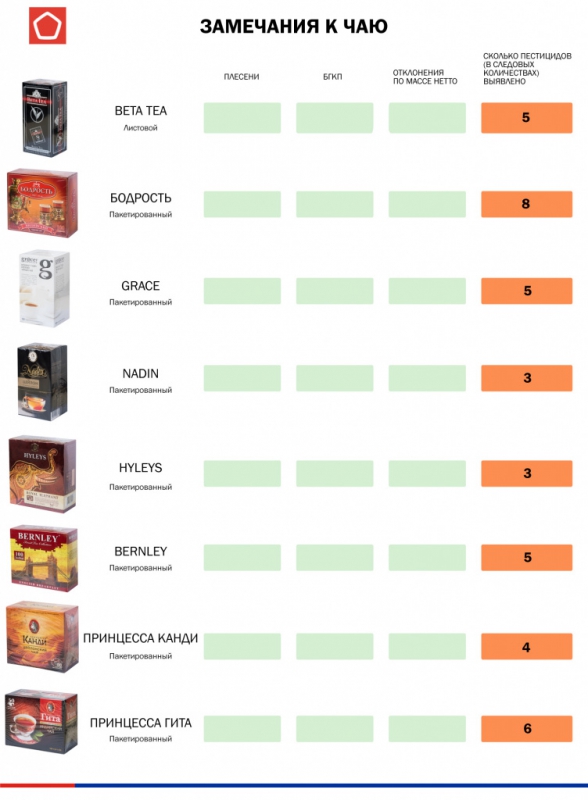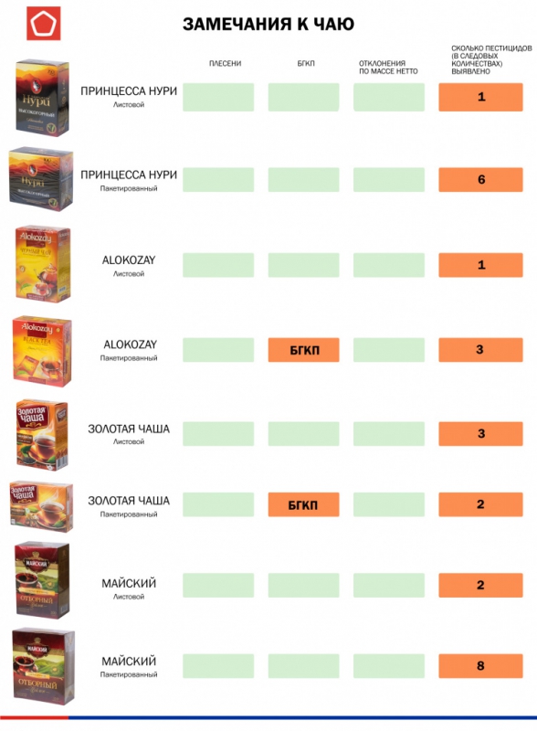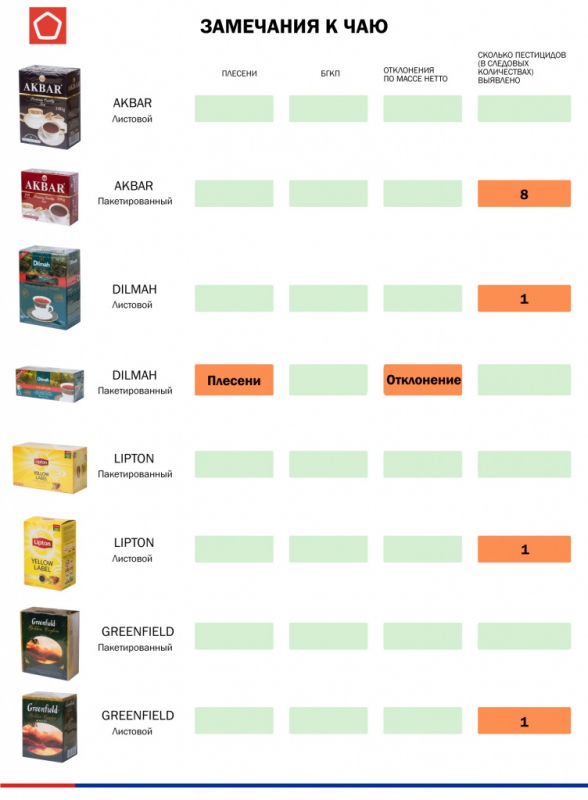 Вместе с этим, пестициды нашли во всех исследованных чаях. Более того, в 11 чаях обнаружили бактерии группы кишечной палочки – Alokozay, «Азерчай», «Золотая чаша», «Императорский», Riston, Gordon, Brooke Bond, Twinings, Richard, «Тот самый чай», а также в листовом «Традиция».