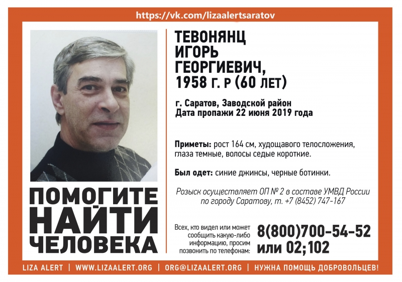 В Заводском районе Саратова почти неделю назад без вести пропал 60-летний Игорь Тевонянц. Об этом сообщили волонтеры поискового сообщества «Лиза Алерт».