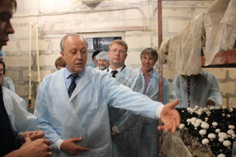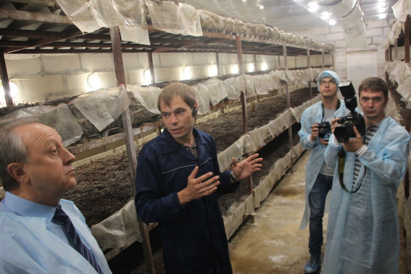 Первым делом губернатору показали упакованные и готовые к продаже шампиньоны, а также специальные подарочные наборы, которые восхитили губернатора. После этого ему показали помещение, где непосредственно выращивают грибы. При этом, по словам представителей комбината, все оборудование – российское. Далее Валерий Радаев проследовал в соседнюю комнату, где грибы оказались уже выросшими.