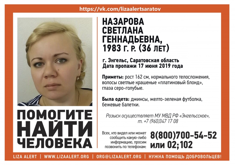 Также разыскивается 36-летняя Светлана Геннадьевна Назарова. Девушка пропала 17 июня. Ее рост 162 см, она нормального телосложения, волосы светлые крашеные «платиновый блонд», глаза серо-голубые. Была одета в джинсы, желто-зеленую футболку и бежевые балетки. Информацию просят передавать инфоргу Марине по номеру 89053850388.