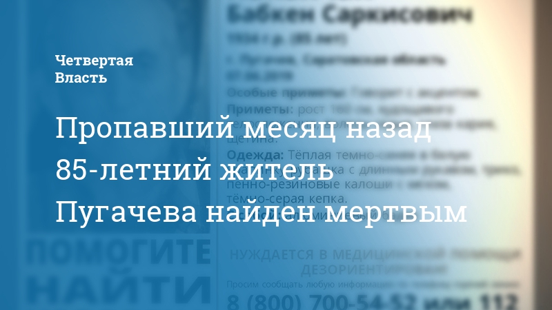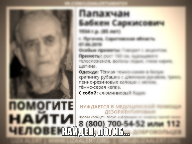 В Пугачеве Саратовской области обнаружен без признаков жизни Бабкен Папахчан, который длительное время считался без вести пропавшим. Об этом заявили волонтеры поискового сообщества «Лиза Алерт».