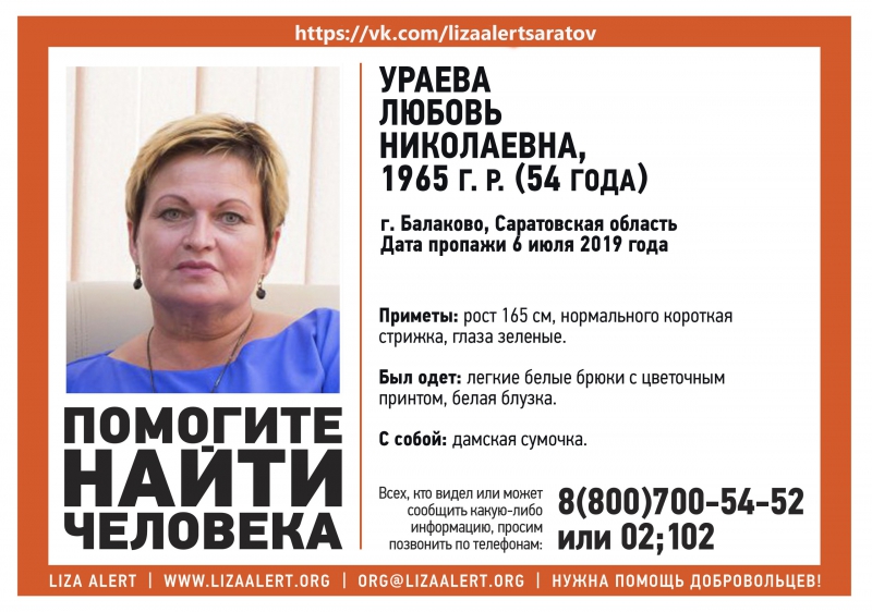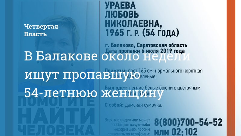 В Балакове Саратовской области без вести пропала 54-летняя Любовь Ураева. Волонтеры поискового сообщества «Лиза Алерт» рассказали, что женщина не дает о себе знать еще с 6 июля.