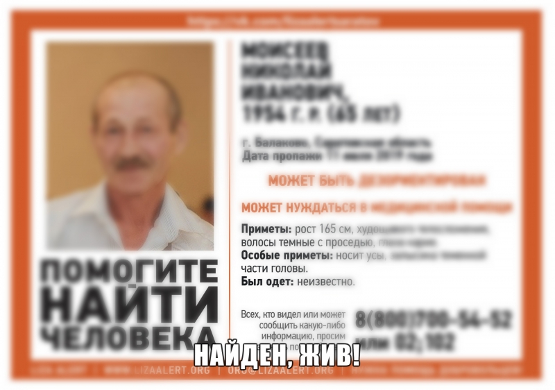 Между тем, вчера также в Балакове искали 65-летнего Николая Моисеева, который мог быть дезориентирован и нуждаться в медицинской помощи. Он ушел утром 11 июня из дома и не вернулся. Теперь поступила информация, что его нашли живым.
