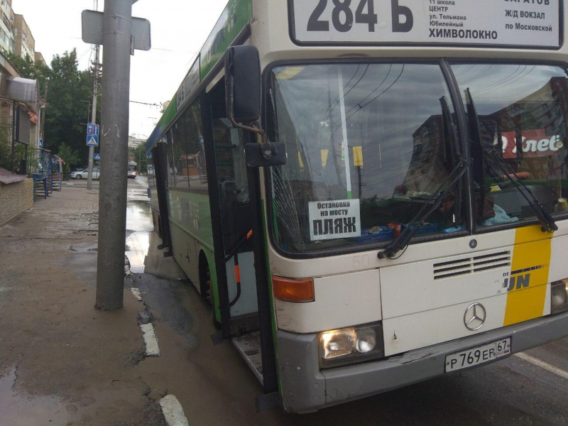 Происшествие случилось около 8.20 на участке улицы Чернышевского между Московской и Челюскинцев. Автобус маршрута №284Б угодил задним колесом в заполненную водой яму.