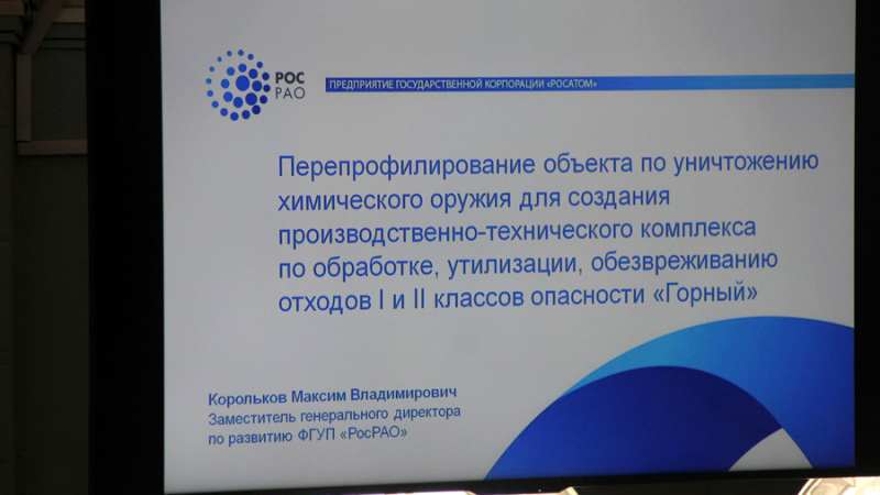 Представитель Минпромторга РФ Антон Судаков рассказал, что в настоящее время проводятся мероприятия по последствию уничтожения химического оружия на комплексе в Горном. Главная задача - дегазировать и привести в надлежащее состояние оборудование. После этого комплекс будет передан РосРАО для выполнения нацпроекта.