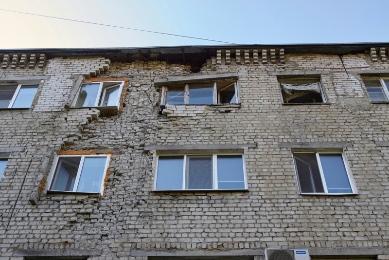 На фотографиях здания видно, что фасад в районе двух верхних этажей серьезно деформирован. Из него выпала часть кирпичной кладки, в одном месте покосился бетонный блок над окном, под крышей также отсутствуют кирпичи.