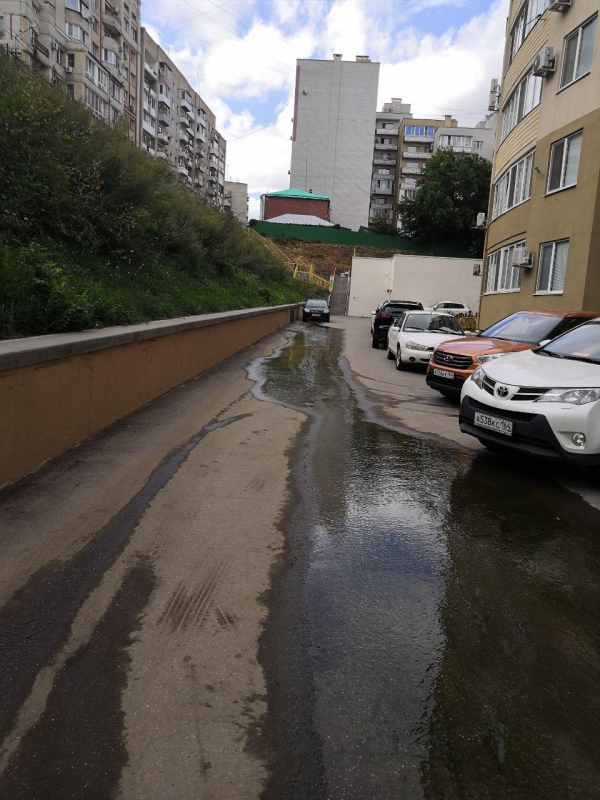 В Волжском районе Саратова двор многоквартирного дома №12 по улице Валовая несколько недель заливает водой из-под бордюра. Ситуация не меняется, несмотря на то, что управляющая компания «Фри ДОМ-К» еще 16 июля направила претензии в ООО «КВС», главе города Михаилу Исаеву и обратилась в прокуратуру.