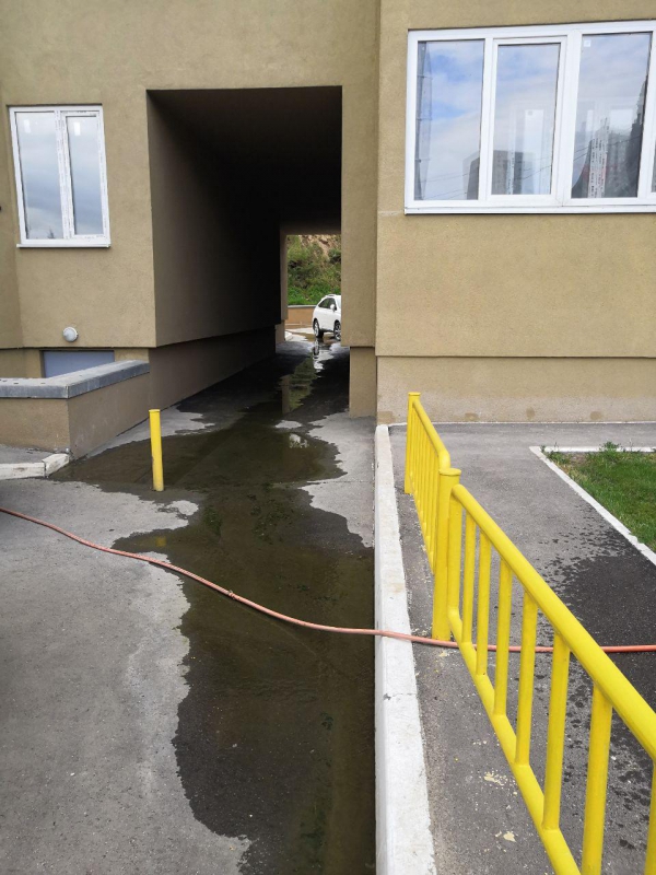 Однако спустя некоторое время двор снова стало заливать водой. На этот раз течь возникла под тротуаром, расположенном под склоном около дома №12.