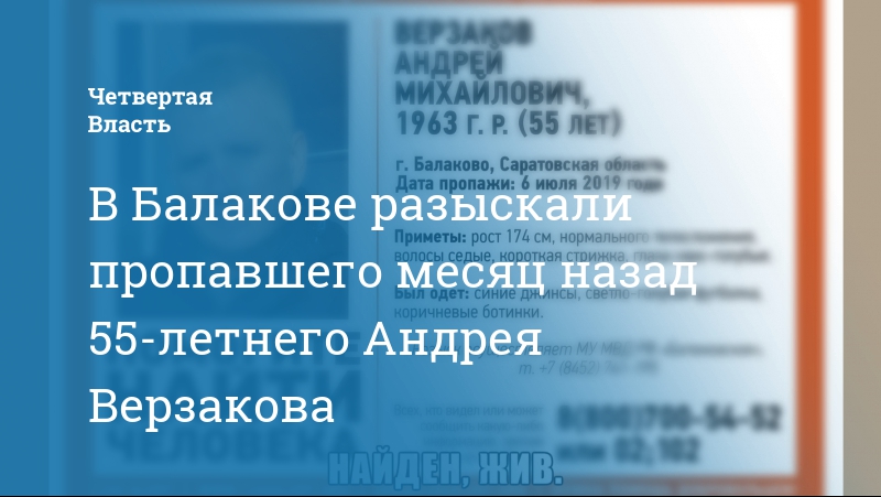 Пропавший 6 июля в Балакове Саратовской области 55-летний Андрей Верзаков найден живым. Об этом сообщает поисковый отряд «Лиза Алерт».
