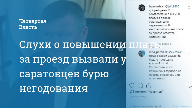 Жители Саратова с большим недовольством встретили новости о повышении платы за проезд в автобусах. Об этом свидетельствуют многочисленные комментарии в соцсетях, в том числе в официальном Инстаграм-аккаунте главы города Михаила Исаева. Тот вынужден был держать ответ.