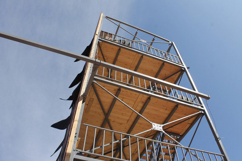 Работы по возведению учебного снаряда подошли к своему концу. Рабочие уже выстроили башню, по которой будут взбираться участники соревнований. Она состоит из четырех этажей и учебной полосы.