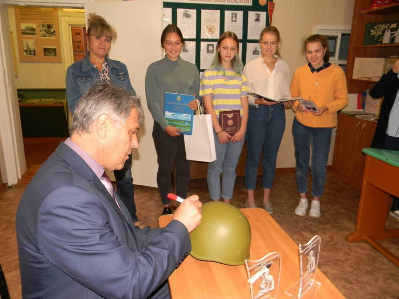 На память о встрече в доме-музее И.В. Панфилова останутся книги, подаренные гостями, а сами они увезут в Павлодар каску с приветственными подписями, которые от имени всех петровчан оставили на ней Николай Ларин и Александр Медведев.