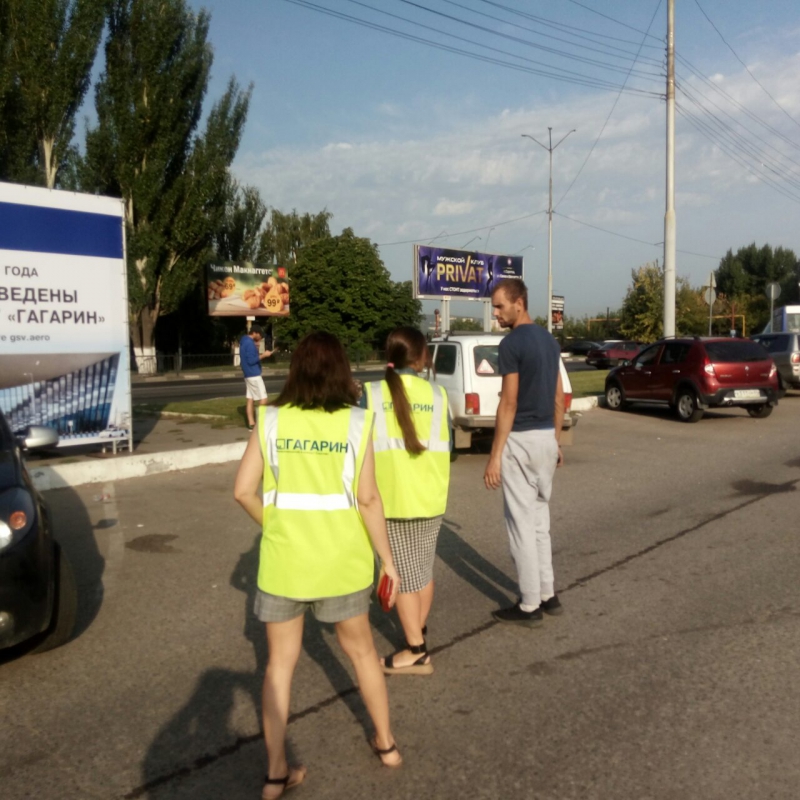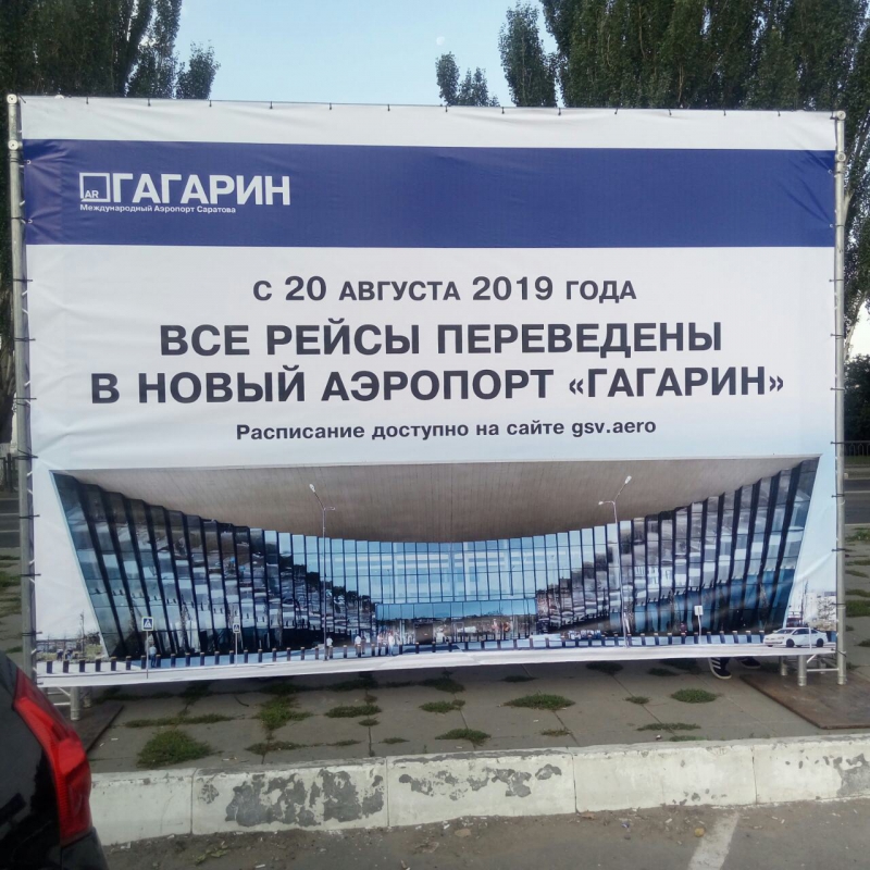 Напротив теперь уже бывшего аэропорта расположен информационный куб, сообщающий о том, что все рейсы переведены в новый аэропорт Гагарин в Сабуровке. На территории находятся несколько групп волонтеров из нового аэропорта. На них ярко-зеленые жилеты с надписью «Гагарин», а в руках таблички со словами «Аэропорт закрыт». Волонтеры направляют людей, которые по ошибке или неведению приехали в недействующий аэропорт.