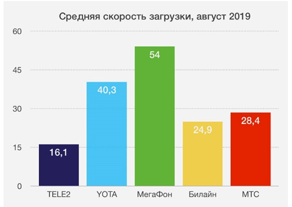 Средняя скорость загрузки у абонентов МегаФона составила 54 Мбит/с. Это на 13,7 мегабит быстрее, чем второй показатель исследования, и в 2 раза лучше, чем третий результат.