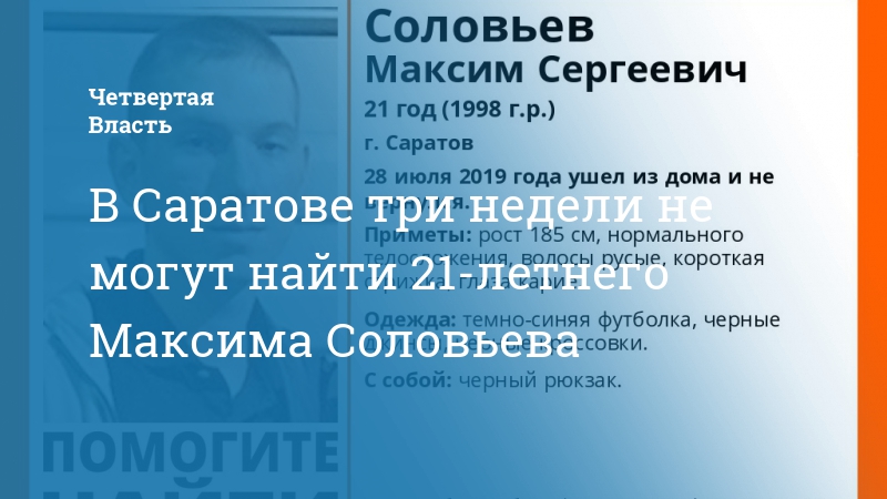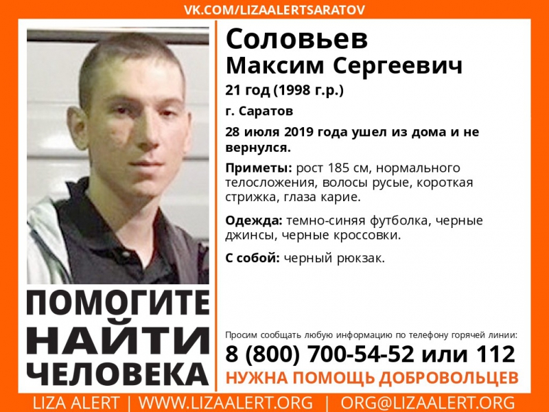 В Саратове пропал 21-летний Максим Соловьев. Как сообщили волонтеры поискового сообщества «Лиза Алерт», известий о нем нет с 28 июля.