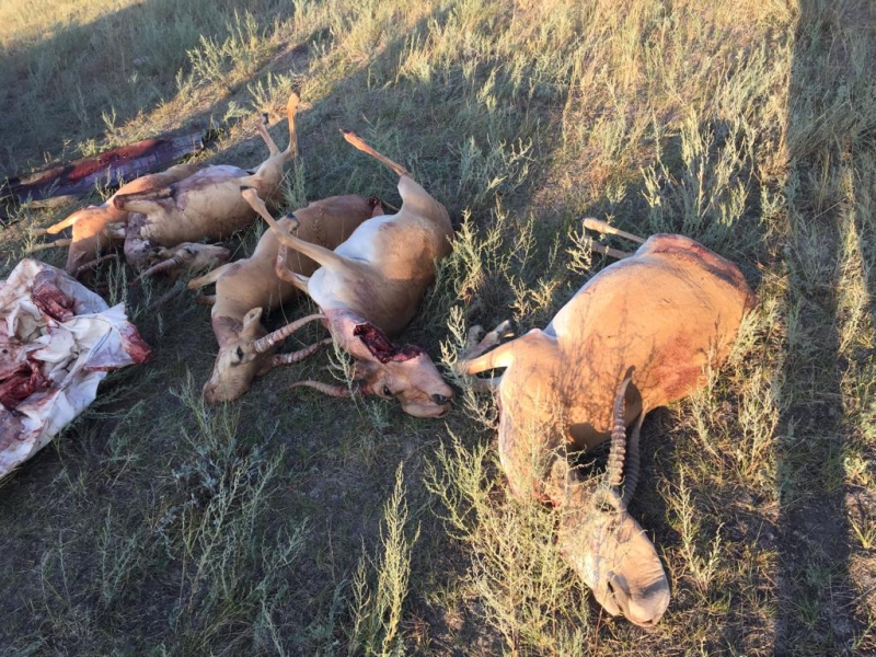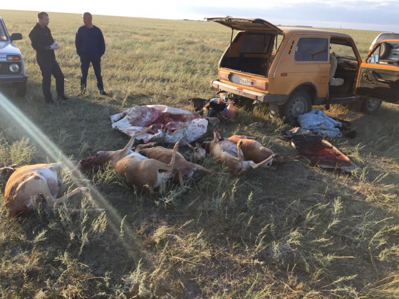 Охотников задержали с поличным. В ходе осмотра места происшествия изъяты 5 туш сайгаков, охотничьи ружья с патронами и другие орудия браконьерской деятельности.