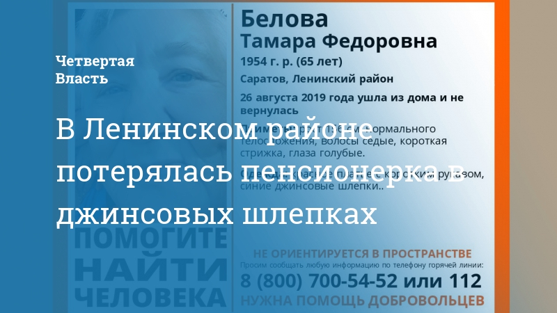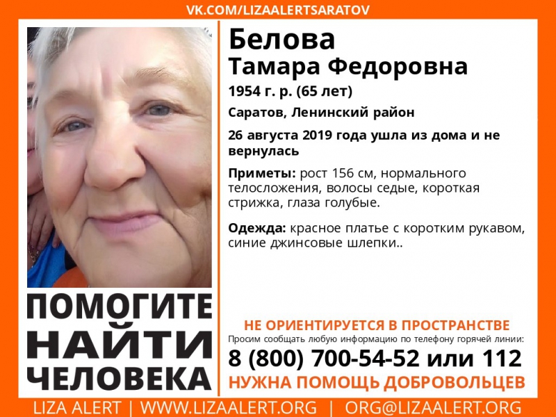 Если у вас есть сведения о местонахождении Тамары Беловой, позвоните по телефонам: 8 (800) 700-54-52 или 112 («Лиза Алерт»).