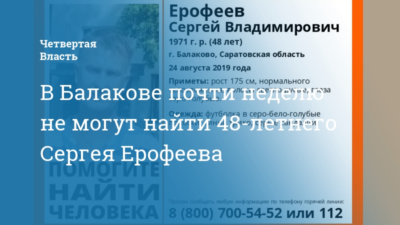 В Балакове Саратовской области пропал 48-летний Сергей Ерофеев. Как сообщили волонтеры поискового сообщества «Лиза Алерт», последний раз его видели 24 августа.