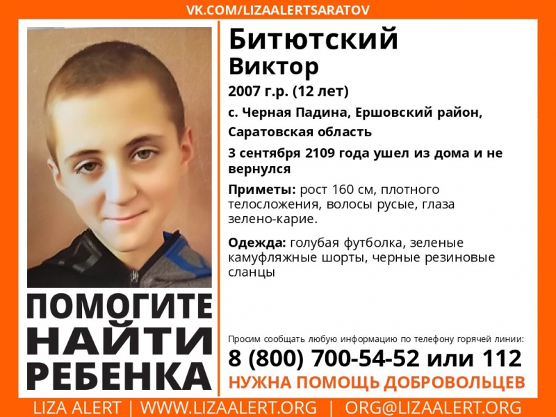 В Ершовском районе Саратовской области пропал 12-летний Виктор Битютский. Как сообщили волонтеры поискового сообщества «Лиза Алерт», последний раз его видели вчера, 3 сентября.