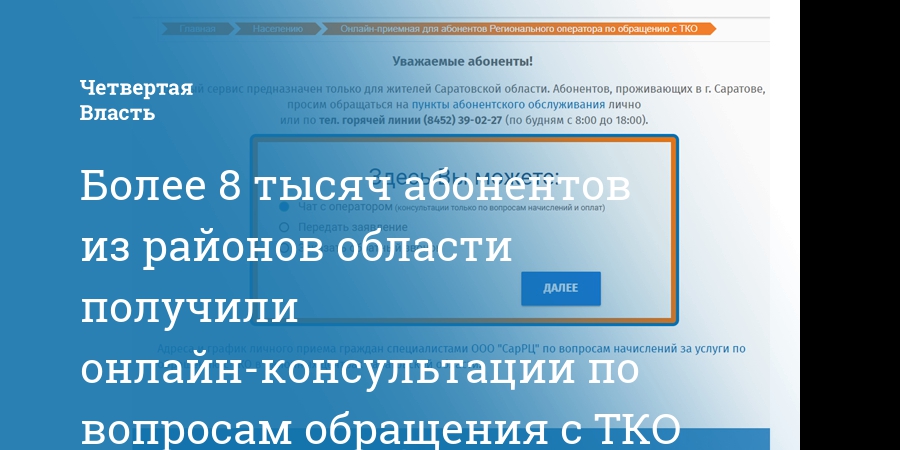 Специально для удобства потребителей из районов области на сайте саррц.рф был создан специализированный сервис «Онлайн-приемная для абонентов регионального оператора по обращению с ТКО».