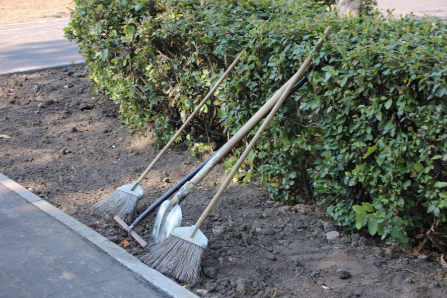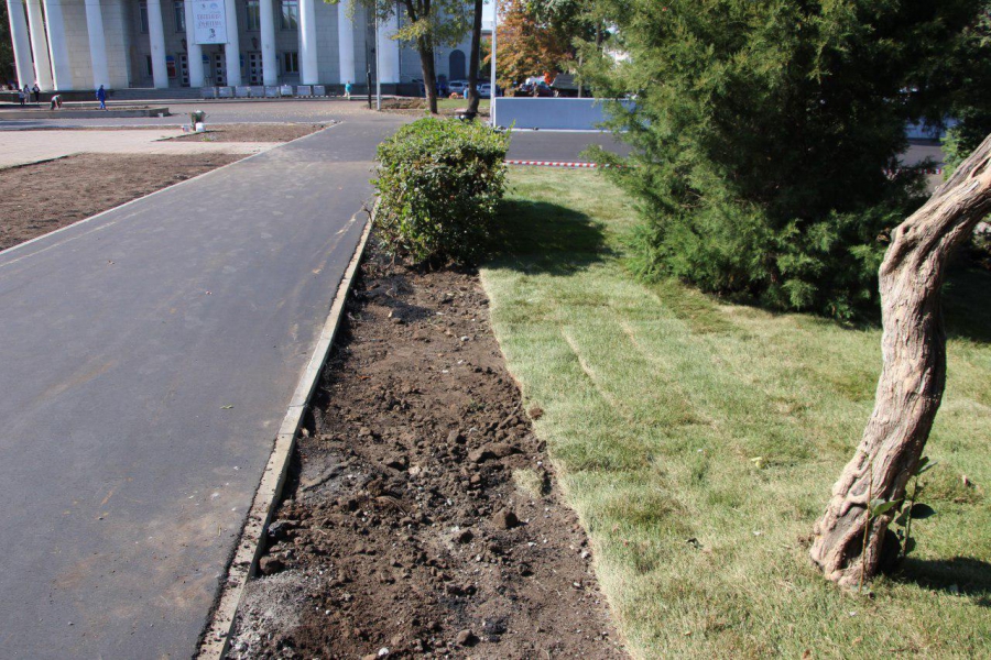 Еще один замеченный недочет сквера – высыхающий газон. Дело в том, что система автоматического полива налажена еще не везде, а рабочие в спешке уже разложили рулонный газон. Более того, это не было бы проблемой, если бы его вовремя полили при укладке. Сейчас же трава попросту выгорает под открытыми лучами солнца. Там, где автополив уже заработал, а это место на ближнем краю к Театральной площади (самое заметное), газон еще остается живым.
