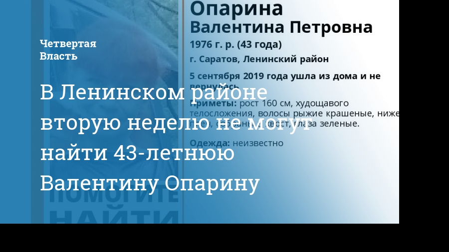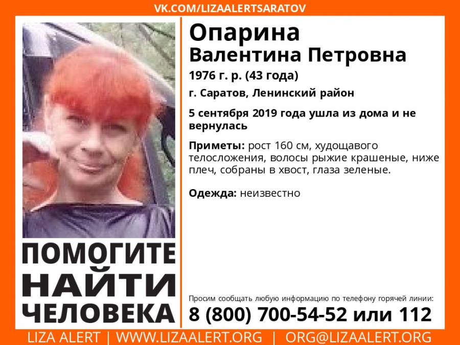 Если у вас есть сведения о местонахождении Валентины Опариной, позвоните по телефонам: 8 (800) 700-54-52 или 112 («Лиза Алерт»).
