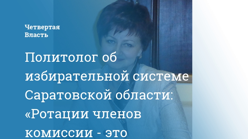 Ротация членов избирательной комиссии Саратовской области положительно сказывается на работе всей местной избирательной системы. Так считает профессор кафедры истории, философии, политологии и социологии ССЭИ РЭУ им. Г.В. Плеханова, доктор политических наук, профессор Татьяна Митрохина.