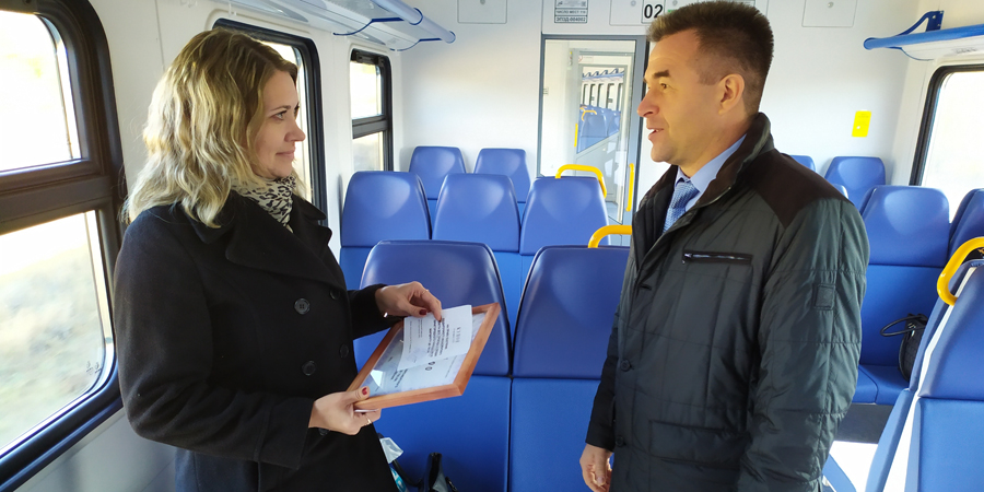 Сотрудники пригородной компании поздравили удачливого пассажира в салоне электропоезда, а попутчики наградили аплодисментами.
