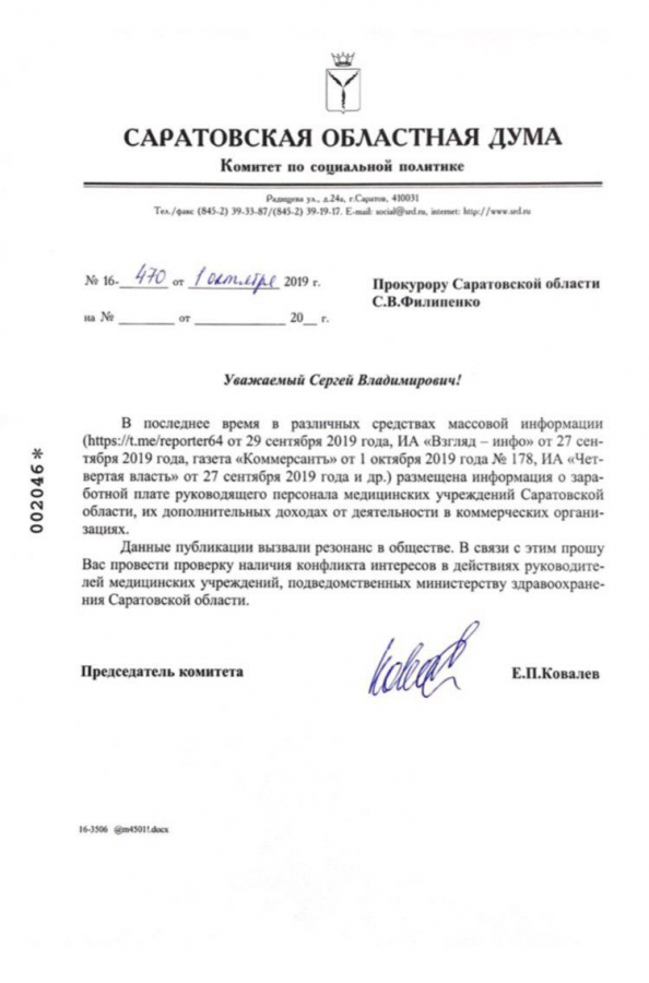 «Прошу провести проверку наличия конфликта интересов в действиях руководителей медицинских учреждений, подведомственных министерству здравоохранения Саратовской области», - говорится в тексте письма.