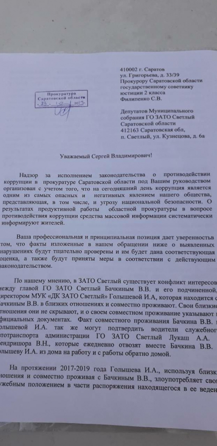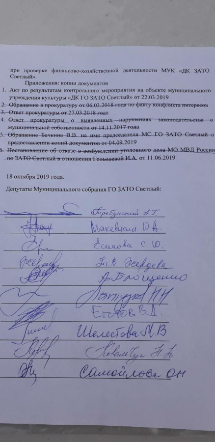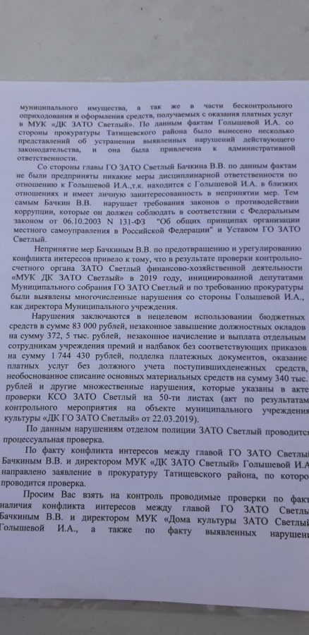 «Просим вас взять на контроль проводимые проверки по факту наличия конфликта интересов между главой Светлый Бачкиным и директором Дома культуры Голышевой, а также по факту выявленных нарушений при проверке финансово-хозяйственной деятельности МУК «ДК ЗАТО Светлый», - обращаются к Филипенко депутаты.