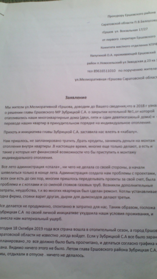 Жители Ершова попросили прокуратуру отстранить от должности Зубрицкую за срыв отопсезона
